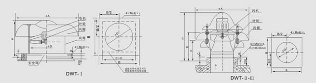 ◇离心式屋顶风机:型号为DWT-Ⅱ型,DWT-Ⅲ型二种型式,适用于风量较小而压力要求较高的场合;